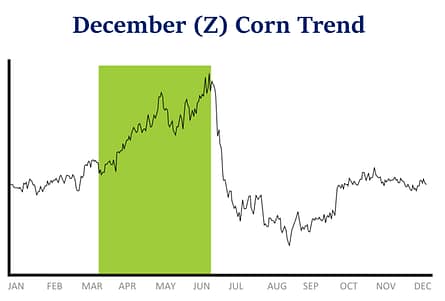 The shaded areas in the charts below represent the months that typically provide opportunities for corn and soybean futures: