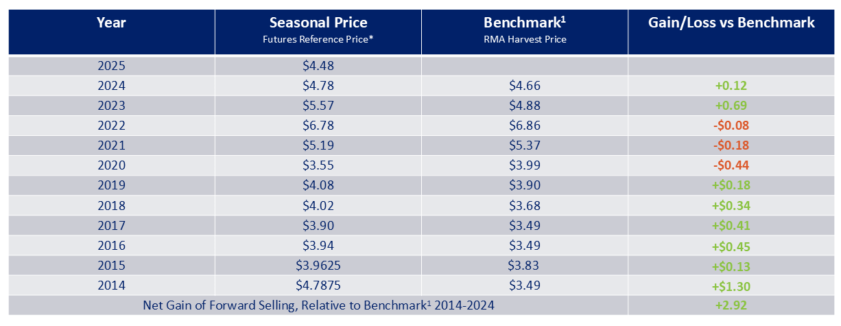 Including ADM’s Seasonal Price contracts in your grain marketing program can provide a framework to protect and enhance your operation’s revenue potential. Over time, the Seasonal Price contract has delivered a strong return on investment (ROI) when compared to the RMA harvest price.